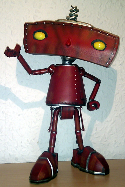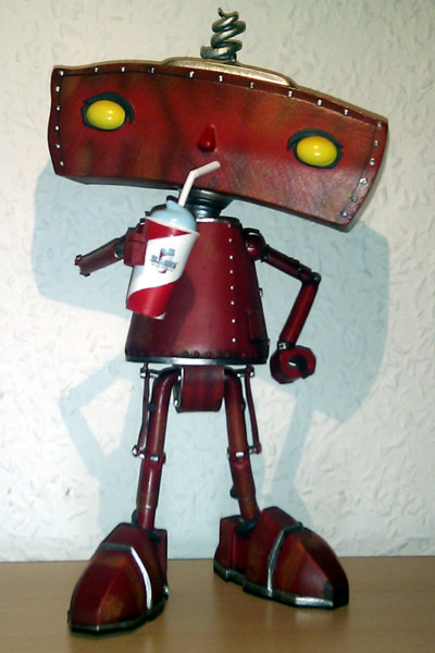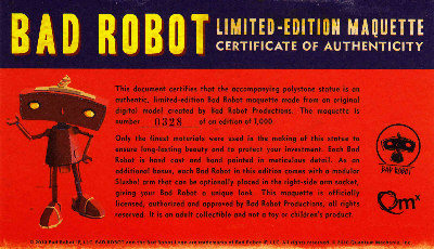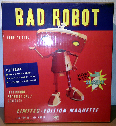 Quantum Mechanix (QMx) released a Bad Robot Maquette in February 2011. According to the packaging, it is hand painted and features no moving parts, exciting robot pose, futuristic red paint and comes with an additional modular "SLUSHO!" arm. Sculpted from the original digital model, the statue is 10 inch tall, cast in solid polystone and weights really heavy.