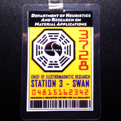 Front shows "Department of Heuristics And Research on Material Applications", the Dharma Swan logo, No. 3728, "Chief of Electromagnetic Research", "Station 3 - Swan", No. 04815162342, "Creating a Brighter Future for All Humanity" and a barcode. Back side is blank. Size is approx. 4 x 2 1/2 inches.