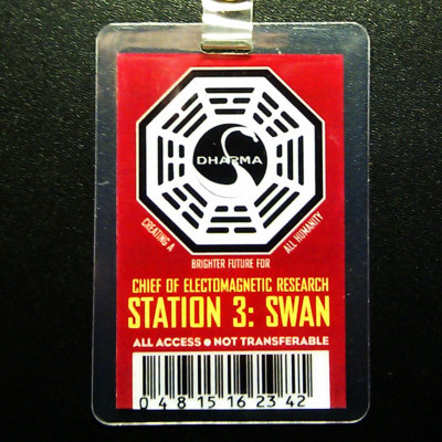 Front shows the Dharma Swan logo, "Creating a Brighter Future for All Humanity", "Chief of Electromagnetic Research", "Station 3: Swan", "All Access - Not Transferable", a barcode and the numbers "0 4 8 15 16 23 42". Back side is blank. Size is approx. 4 x 2 1/2 inches.