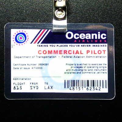 Front shows Oceanic Airlines logo, "Taking You Places You've Never Imagined", "Commercial Pilot", "Department of Transportation - Federal Aviation Administration", "Certificate Number: 2654291, Date of Issue: 4/7/2003", "Properly qualified to excercise the privileges of operating single and multi-engine land instrument airplanes and commercial jetliners", "Flight: 815, From: SYD, To: LAX" and a barcode with the number "48151 62342". In the background appears a Federal Aviation Administration watermark. Back side is blank. Size is approx. 4 x 2 1/2 inches.