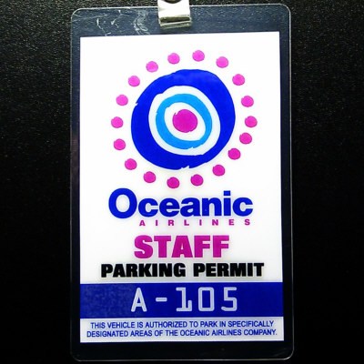 Front shows Oceanic Airlines logo, "Staff Parking Permit A-105", and "This Vehicle is Authorized to Park in Specifially Designated Areas of the Oceanic Airlines Company". Back side is blank. Size is approx. 3 1/2 x 5 1/2 inches.