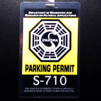 Front shows "Department of Heuristics And Research on Material Applications", the Dharma Swan logo, "Parking Permit S-710", and "This Vehicle is Authorized to Park in Specifially Designated Areas of Hanso Foundation Facilities". Back side is blank. Size is approx. 3 1/2 x 5 1/2 inches.