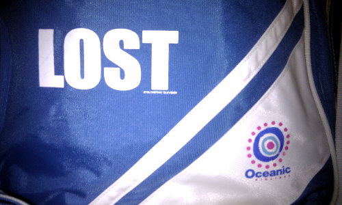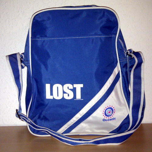 Blue and white small bag with "LOST" and "Oceanic Airlines" logos. The bag has a large zip pocket, a slim pocket on front side and a shoulder strap. Size is approx. 12 x 14 x 4 inches. Official merchandise from ABC.