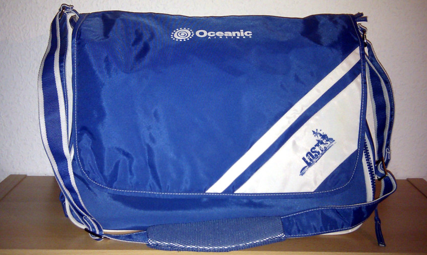 Blue and white large bag with "Oceanic Airlines" and "LOST" logos. The bag has a large zip pocket, two zip pockets on left and right side, a slim pocket on front side and a shoulder strap. Size is approx. 20 x 14 x 11 inches. Official merchandise from ABC.