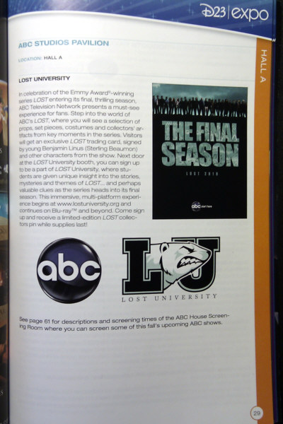 The official Disney D23 Expo 2009 Guide Book. 74 pages, size is 6 x 9 inch. Page 29 describes what attendants will await at ABC Studios' LOST pavilion.