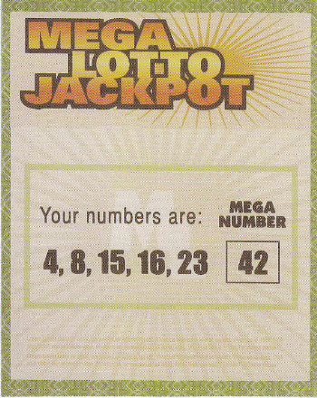 "Mega Lotto Jackpot" lottery ticket with the winning numbers 4, 8, 15, 16, 23, 42 as a magnet. From the Walt Disney Archives Collection (logo is printed on the back side). This magnet was purchased at the 2011 D23 Disney Expo. Measures 3.3 x 4 inch.