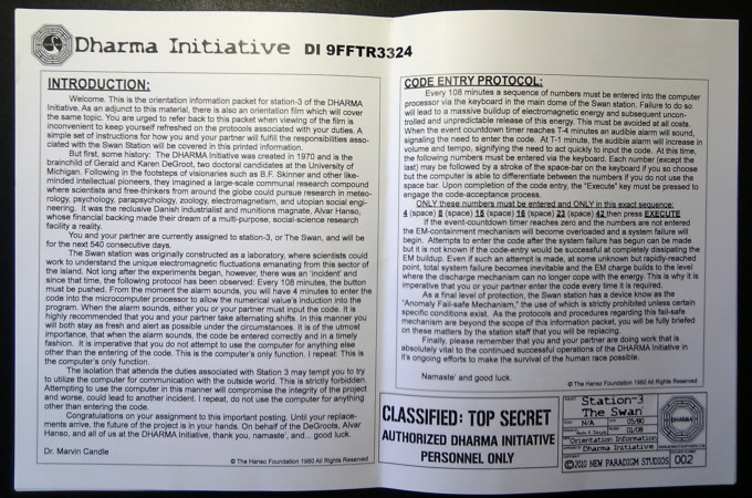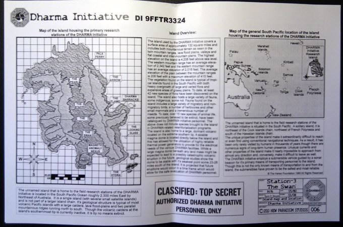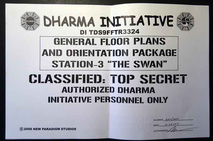 A set of 8 "blueprint" sheets set up as a information package for new recruits of the Dharma Initiative Station 3 "The Swan". The set contains floor plans of the main and sub level of "The Hatch", information about Swan Station procedures, the EM anomaly, the incident, the Island itself and more. Each sheet measures 17 x 11 inch and is drawn by New Paradigm Studios.
