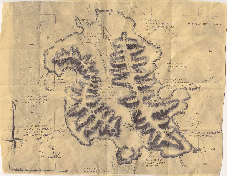 One of the maps drawn by Danielle Rousseau during her 16 years on the Island. All her maps and notes were taken by Sayid Jarrah. The map measures 10 1/2 x 8 1/2 inch.