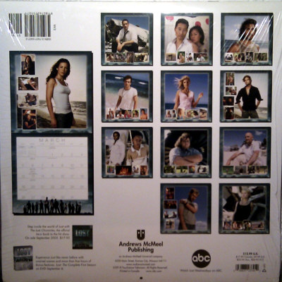 The LOST 2006 wall calendar was published by Andrews McMeel Publishing and consists of 24 pages with one or two large, 4 small cast photos and one calendar sheet for each month. The dimensions are 12 x 11.8 inches, retail price was $12.99. The calendar is still sealed.