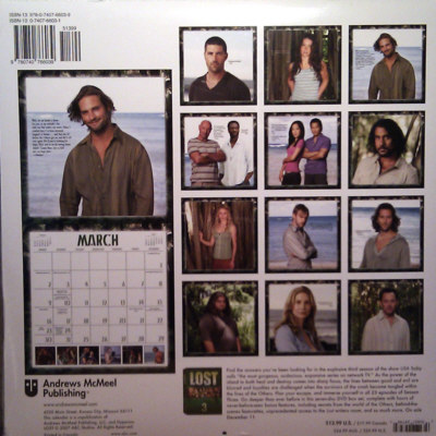 The LOST 2008 wall calendar was published by Andrews McMeel Publishing and consists of 24 pages with one or two large photos, quotes from the show and one calendar sheet with 6 LOST show snapshots for each month. The dimensions are 12 x 11.8 inches, retail price was $13.99. The calendar is still sealed.