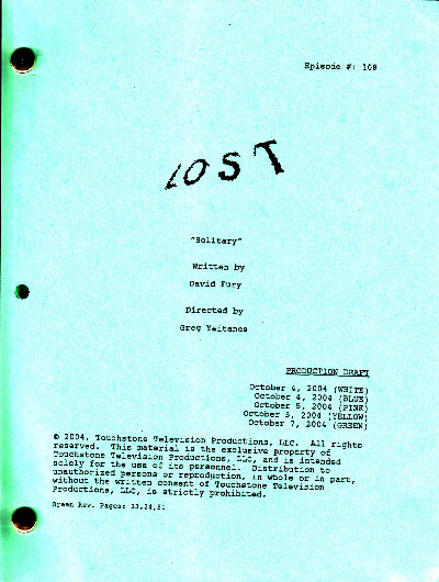 This is a photo-copy of the script for the LOST Season 1 Episode 9 "Solitary" which was handed out to the cast and crew. The script was written by David Fury, the Episode was directed by Greg Yaitanes. This edition of the script is a production draft dated October 4 to October 7, 2004 and is 56 pages long.