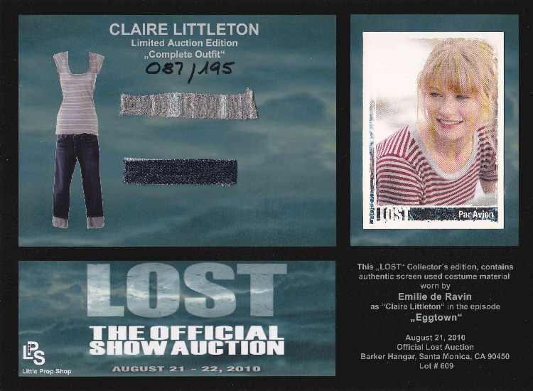 Costume Prop Card Emilie de Ravin as Claire Littleton Limited Auction Edition "Complete Outfit" from Little Prop Shop LOST - The Official Show Auction - August 21-22, 2010 |