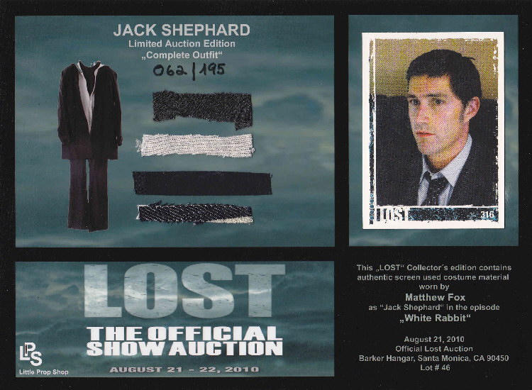 Costume Prop Card Matthew Fox as Jack Shephard Limited Auction Edition "Complete Outfit" from Little Prop Shop LOST - The Official Show Auction - August 21-22, 2010 |