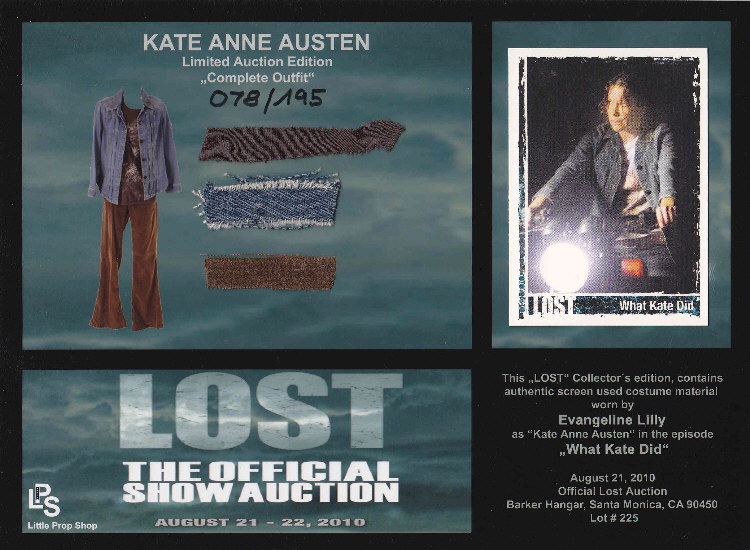 Costume Prop Card Evangeline Lilly as Kate Anne Austen Limited Auction Edition "Complete Outfit" from Little Prop Shop LOST - The Official Show Auction - August 21-22, 2010 |