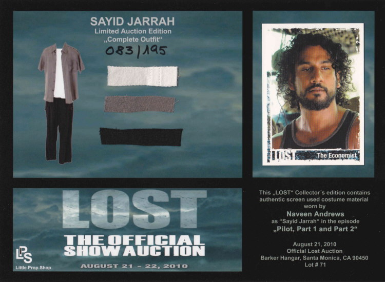 Costume Prop Card Naveen Andrews as Sayid Jarrah Limited Auction Edition "Complete Outfit" from Little Prop Shop LOST - The Official Show Auction - August 21-22, 2010 |