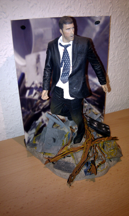 The figure stands 8 1/2 inch tall on a base detailed with crash debris and includes a photographic backdrop of plane wreckage. His pose is stumbling through wreckage, as seen in S1E01 - Pilot, Part 1.