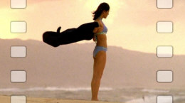The 6 inch tall figure is depicted standing at the beach in her bikini with a towel fluttering in the wind. As seen in