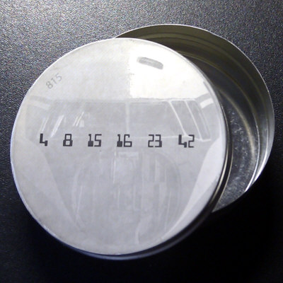 This Dharma Initiative necklace by Olga Ganoudis features one strand of knotted brown leather with a sterling silver dog tag with the main Dharma Initiative logo. The necklace comes in a round tin can. It was sold in the official ABC LOST shop on internet, the original price was $44.95.