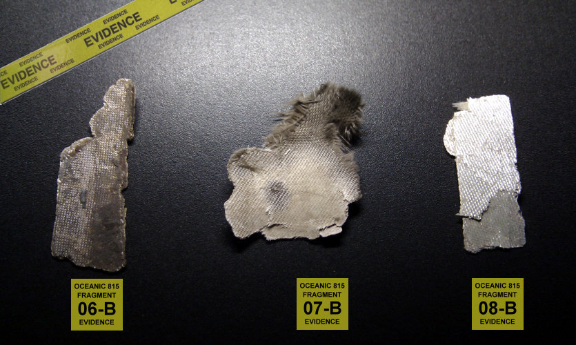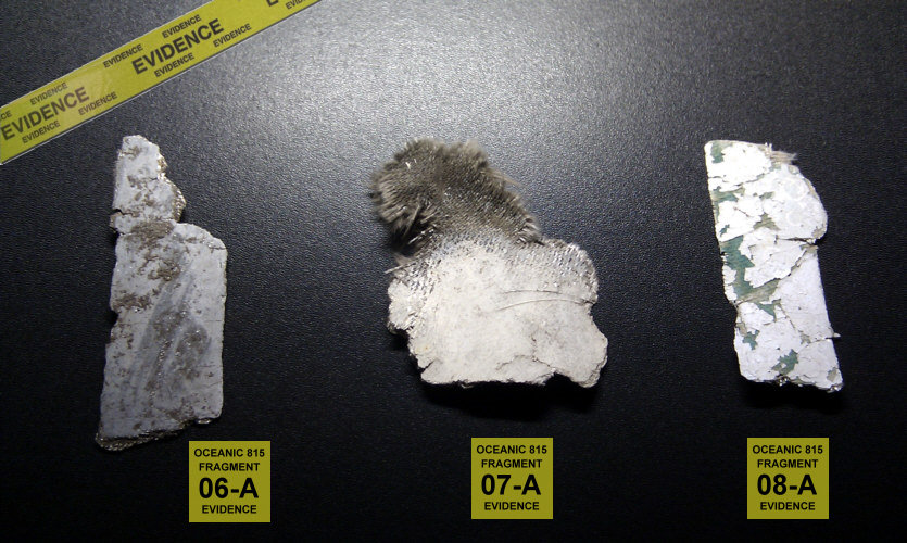 This are three authentic Oceanic Airlines Flight 815 airplane fragments found at the LOST Season 1 filming site at Mokule'ia Beach, North Shore Oahu, Hawaii. The pieces were collected after filming was completed and the LOST crew had removed the wreckage from the scene and left the area completely.