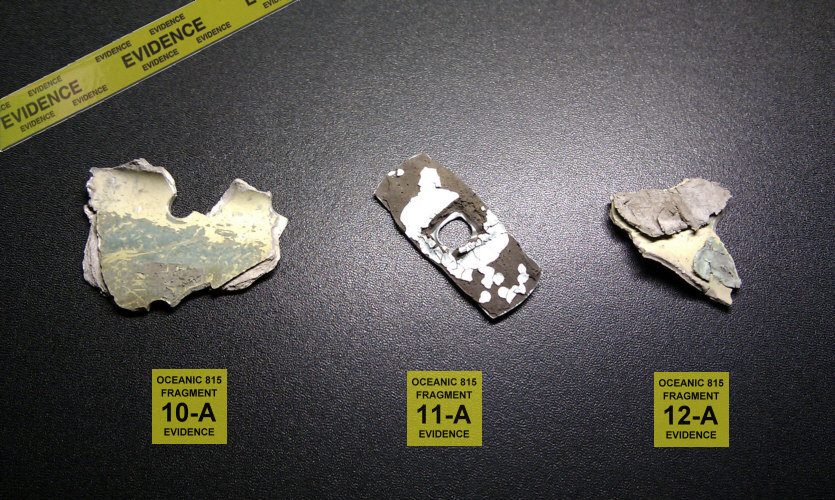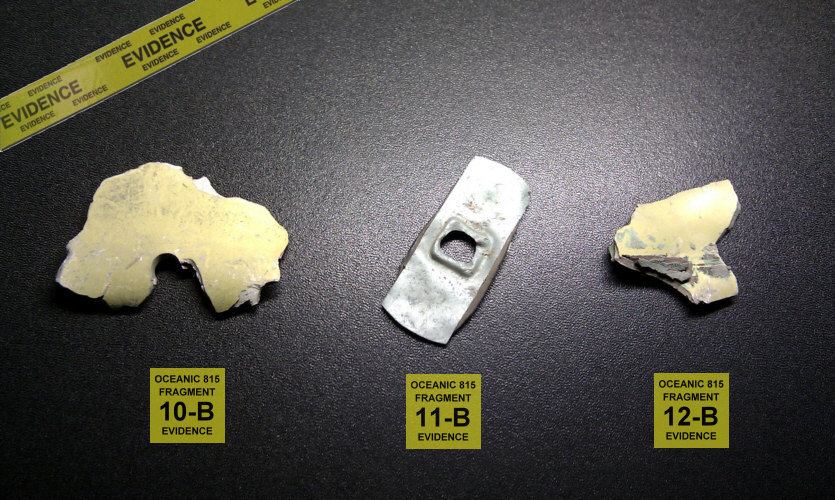 This are three authentic Oceanic Airlines Flight 815 airplane fragments found at the LOST Season 1 filming site at Mokule'ia Beach, North Shore Oahu, Hawaii. The pieces were collected after filming was completed and the LOST crew had removed the wreckage from the scene and left the area completely.