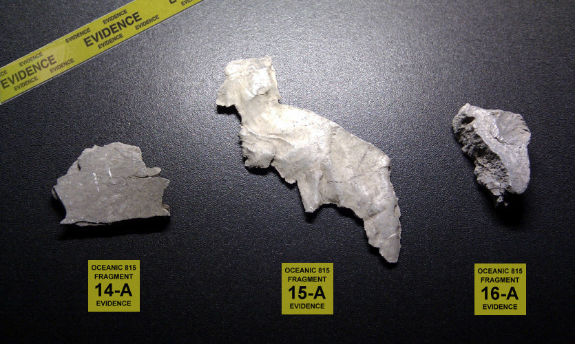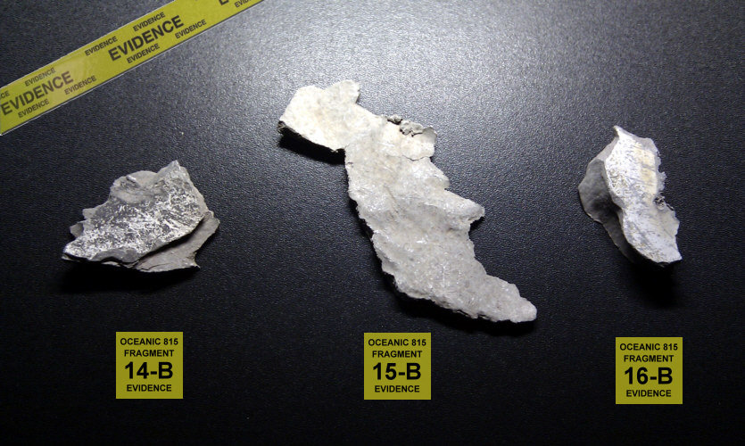 This are three authentic Oceanic Airlines Flight 815 airplane fragments found at the LOST Season 1 filming site at Mokule'ia Beach, North Shore Oahu, Hawaii. The pieces were collected after filming was completed and the LOST crew had removed the wreckage from the scene and left the area completely.