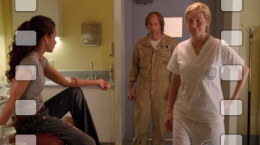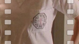 Juliet Burke wearing a scrub with Dharma Staff Station logo patch.