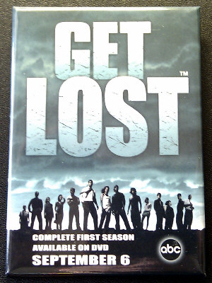 This pin features "GET LOST - COMPLETE FIRST SEASON AVAILABLE ON DVD SEPTEMBER 6 with ABC logo and between the iconic LOST Season 1 main cast photo. It was given out at the San Diego Comic Con 2005 to promote the LOST Season 1 DVD release. Size is 2 1/2 by 3 1/2 inch.