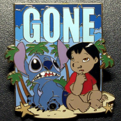 Disney Company enameled Pin in limited edition of 500. Features Lilo & Stitch sitting on a beach under blue clouds. On top reads "GONE". A worried Lilo and Stitch ponder their fate in this tribute to the LOST show. Pin was released on October 31, 2005 at a original price of $10.95.