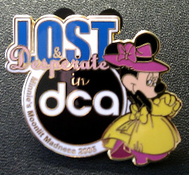 Disney Company enameled Pin in limited edition of 1000. Features Minnie Mouse wearing a pretty yellow bowed dress with pink hat and shoes, and the text "Lost & Desperate in DCA" and "Minnie's Moonlit Madness 2005.