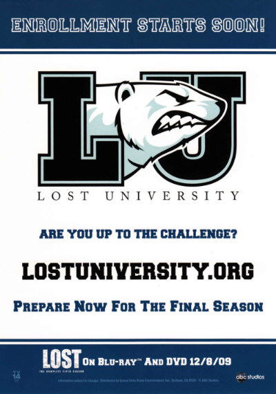 The front side announces the enrollment for the LOST University. On the back side there's a "handwritten" note and phone number which is a tie-in to the upcoming Season 5 DVD set. The size is 5 x 7 inch, larger than a common postcard. It was given out at the LOST panel on the San Diego Comic Con 2009.