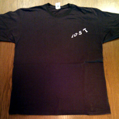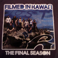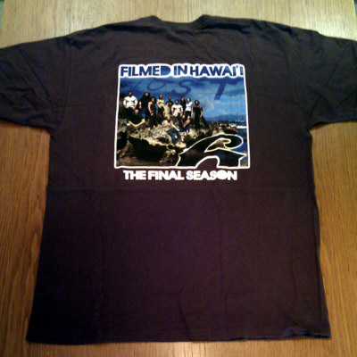 Color is brown, front shows the LOST Film Crew logo, the back side shows "FILMED IN HAWAI'I", a LOST cast photo showing them standing on a rock on the coast with "LOST" written in the sky and a large "6" on right bottom corner and below "THE FINAL SEASON". Printed in white on front, the back side is colored.