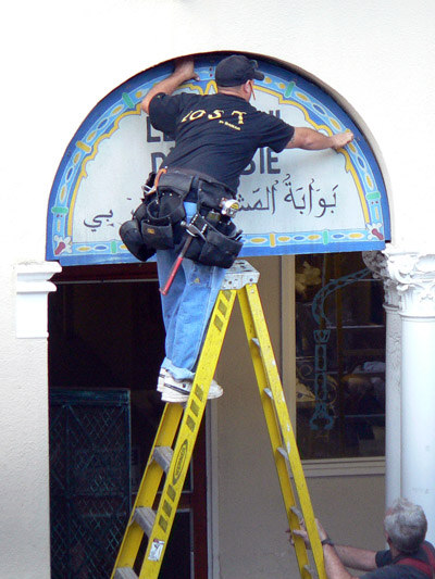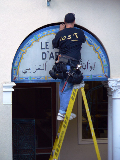 Thanks to Ryan from Hawaii Blog for the photos. (Photos taken on Dec 07, 2006 in downtown Honolulu, HI) A LOST crew worker mounts an Arabic sign, wearing a similar LOST crew shirt.