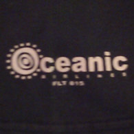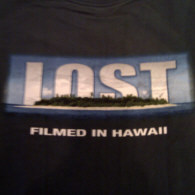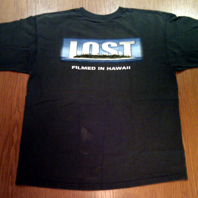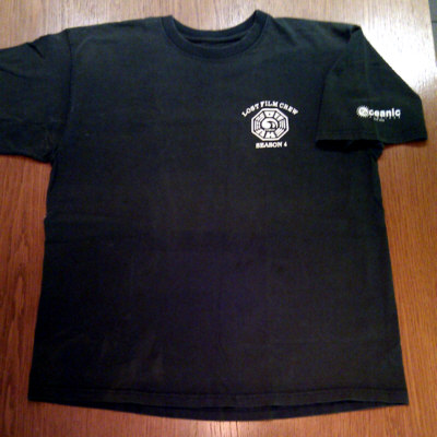Color is dark green, front shows "LOST FILM CREW", the Dharma Tempest Station logo and "SEASON 4". Back side shows the Island with large "LOST" letters on it and below "FILMED IN HAWAII". The left sleeve shows the Oceanic Airlines logo and below "FLT 815". Everything printed in white except the LOST Island which is colored.