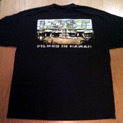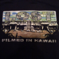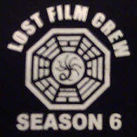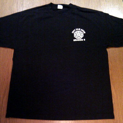 Color is black, front shows "LOST FILM CREW", below a DHARMA Orchid Station logo and "SEASON 6" printed in white, the back side shows "LOST" in large letters, The Others temple and below "FILMED IN HAWAII" in colored print.