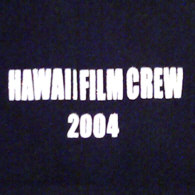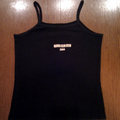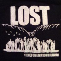 Color is black, front shows "HAWAII FILM CREW 2004", the back side shows "LOST" in large letters and below a silhouette of the LOST cast with palms and hills in the background and below "FILMED ON LOCATION IN HAWAII". The print is in white color with glittery effect.
