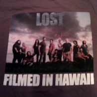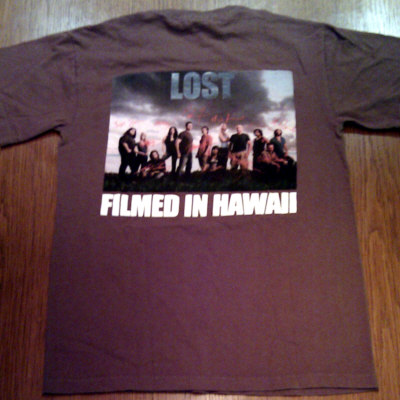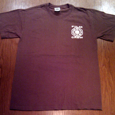 Color is brown, front shows the Dharma Initiative Orchid Station logo in between "FILM" and "CREW", the back side shows an autographed LOST cast photo and below "FILMED IN HAWAII". Printed in white on front, the back side is colored.