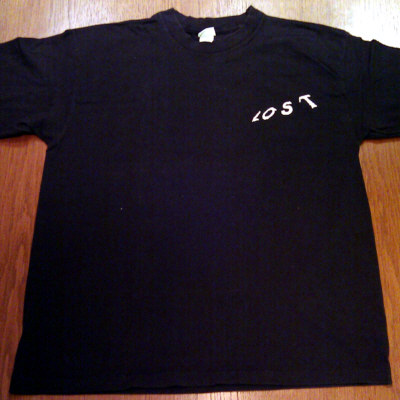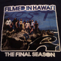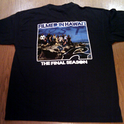 Color is black, front shows the LOST Film Crew logo, the back side shows "FILMED IN HAWAI'I", a LOST cast photo showing them standing on a rock on the coast with "LOST" written in the sky and a large "6" on right bottom corner and below "THE FINAL SEASON". Printed in white on front, the back side is colored.
