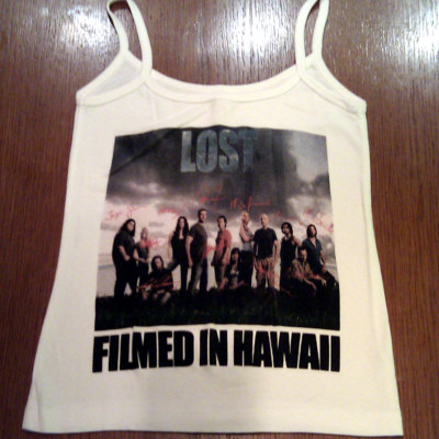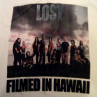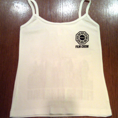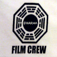Color is white, front shows the Dharma Initiative main logo and below "FILM CREW", the back side shows an autographed LOST cast photo and below "FILMED IN HAWAII". Printed in black on front, the back side is colored.
