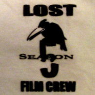 Color is white, front shows "LOST" and "FILM CREW" and in between "SEASON 5" with a raven sitting on the 5. The back side shows a LOST Island photo background with large "LOST" letters on top, a raven is sitting on the T. Below it reads in white letters "CONSTRUCTION", "SEASON 5", and "BUILT IN HAWAI'I". On the right side there's the shape of the Hawaiian Islands. It seems the raven is the mascot of the LOST Construction Team.