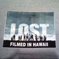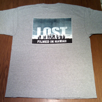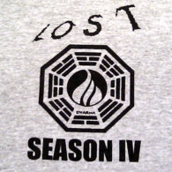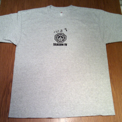 Color is light gray, front shows a LOST Film Crew logo, below a DHARMA Flame logo and "SEASON IV", the back side shows a LOST "FILMED IN HAWAII" logo.