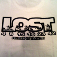 Color is white, front shows the Dharma Initiative Swan Station logo and "FILM CREW", the back side shows a LOST logo, the numbers "4 8 15 16 23 42" and "FILMED IN HAWAII", everything on back in outlined letters. Logos and letters are printed in black color.
