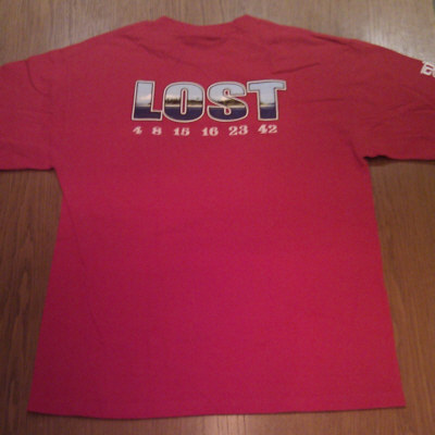 Color is red, front shows "LOST SEASON 5", the Dharma Lamp Post logo and "FILM CREW", the back side shows a LOST logo with the island depicted in the letters, and the Numbers "4 8 15 16 23 42". On the right sleeve is an Ajira Airways logo. Letters and logos printed in white, the LOST logo on the back is colored.