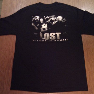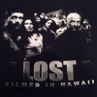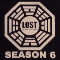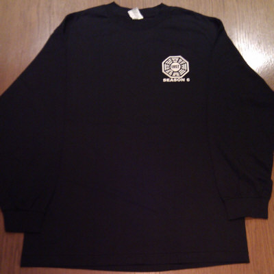 Color is black, front shows a DHARMA Pearl logo with "LOST - FILMED IN HAWAII" inside the pearl, below "SEASON 6", the back side shows a cast photo and below "LOST, FILMED IN HAWAII". Everything printed in white on black.