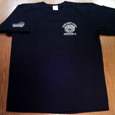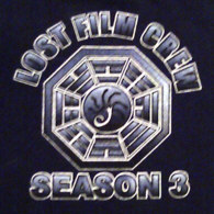 Color is black, front reads "LOST FILM CREW" and "SEASON 3", inbetween the Dharma Hydra Station logo, the back side shows a LOST logo with the island depicted in the letters, and "FILM CREW". A "HANSO FOUNDATION" logo is depicted on the right sleeve. Printed in white and blue, the LOST logo on back side is colored.