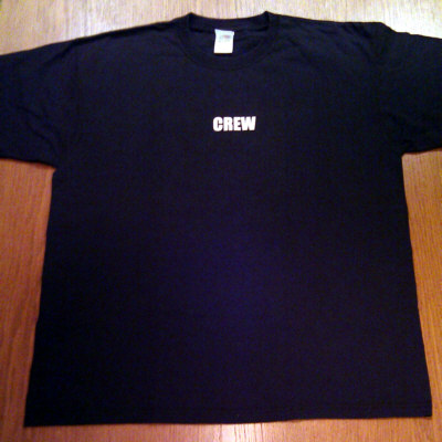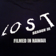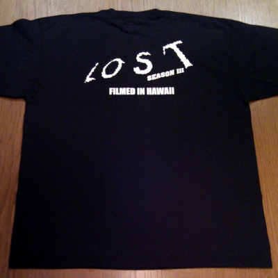 Color is black, front shows "CREW" , the back side a LOST Film Crew logo and below "SEASON III", and "FILMED IN HAWAII". Everything printed in white on black.