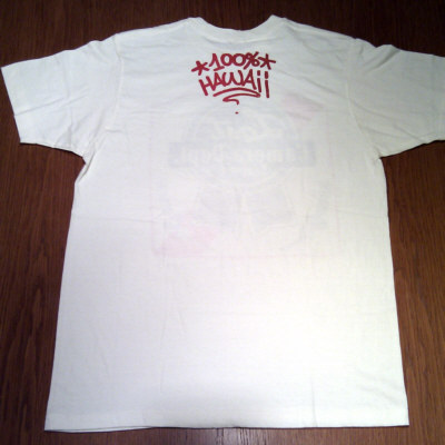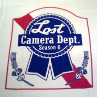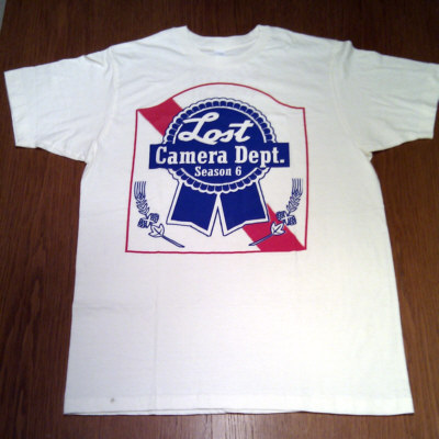 Color is khaki, front shows the "Pabst Blue Ribbon Beer" logo but instead of the original inscription it reads: "LOST - Camera Dept. - Season 6" where "LOST" is written in the style of "Pabst" and "Camera Dept." in the style of "Blue Ribbon", the back side shows "*100%* Hawaii". Printed in blue / red on front and red on back.