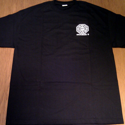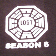 Color is black, front shows a DHARMA Pearl logo with "LOST" inside the pearl, below "SEASON 6", the back side shows a cast photo and below "LOST, FILMED IN HAWAII". Everything printed in white.