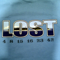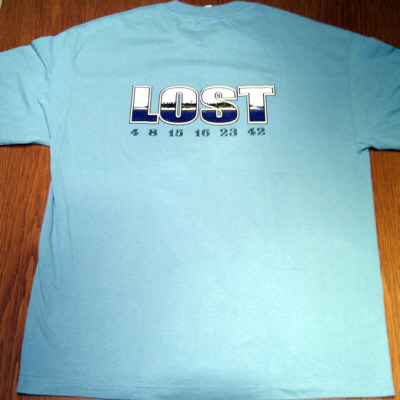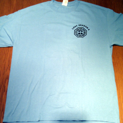 Color is light blue, front shows "LOST SEASON 6" and below the Dharma Lamp Post logo, the back side shows a LOST logo with the island depicted in the letters, and the Numbers "4 8 15 16 23 42". Printed in black on front, the numbers on the back are green.
