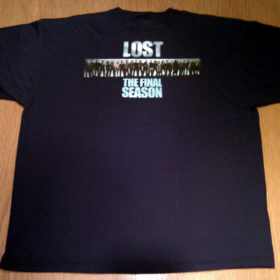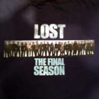 Color is black, front shows the LOST Crew logo, the back side shows a LOST logo, "THE FINAL SEASON" and between a cast photo. Printed in white on front, the back side is colored.