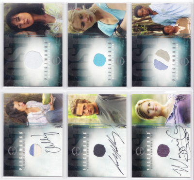 Set of 12 cards featuring pieces of the actual costumes worn on-screen during LOST Season One, including a dual-costume card. (Appx. 1:36 packs, that's one per box). Additional 3 randomly inserted autographed pieceworks cards featuring costumes and signatures were available.